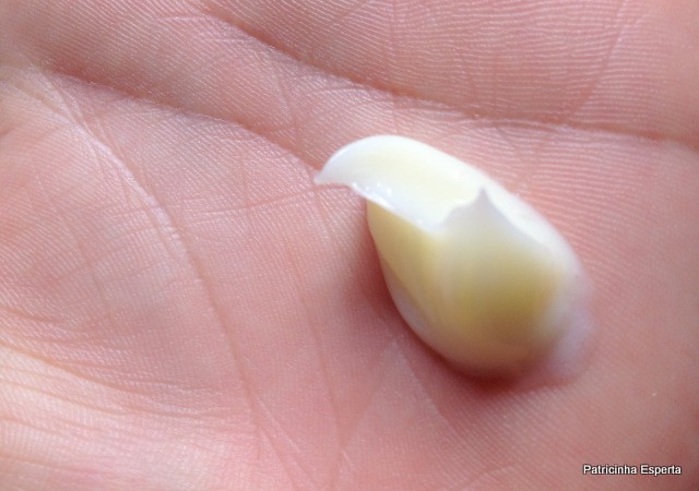 A textura é cremosa e grossinha, e o cheiro é suave, nem bom, nem ruim.