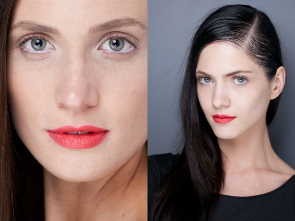 Helder Rodriguez buscou a mesma combinação de ousadia e suavidade no make: pele bem leve e olhos fortes, com sombra marrom cintilante e muito rímel, além de blush pêssego e batom coral cintilante.