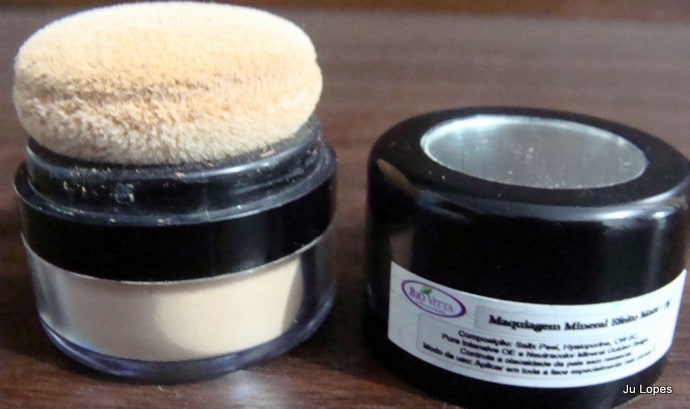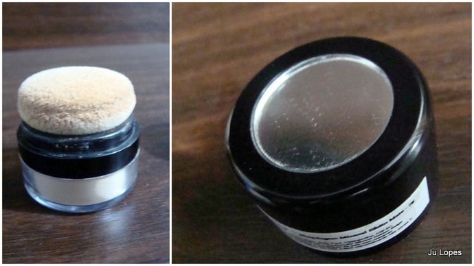 A embalagem é um potinho de plástico resistente com esponja aplicadora e espelhinho na tampa. Fiquei com medo de “vazar” pó por todo canto, mas ela tem um tal de sistema dispensing que evita que isso aconteça. O cheiro é bem suave e a textura é de pó.