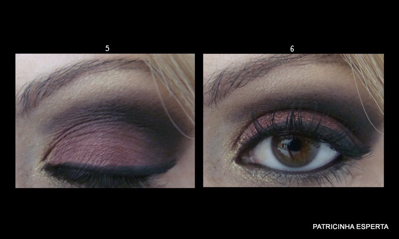 Apliquei delineador preto na raiz dos cílios superiores ( foto 5). Passei lápis preto na linha d`água dos cílios inferiores e duas camadas de rímel (foto 6)