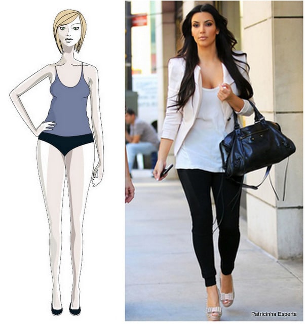 Nesse tipo de corpo, a medida dos quadris é mais larga que a dos ombros. Portanto, o intuito aqui é neutralizar os quadris e as coxas, que geralmente são mais grossas, e chamar a atenção para o ombro, para o busto, que é a parte mais fina do corpo, ampliando-os visualmente.