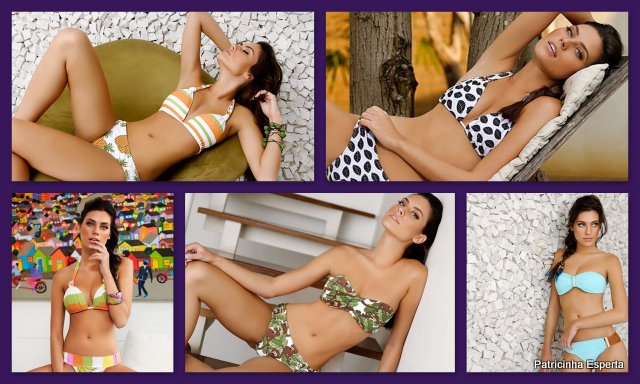 O biquíni ideal tem a parte de cima estampada, de preferência amarrado nos pescoço para “alargar” os ombros, e a parte de baixo lisa, para suavizar e equilibrar a silhueta.