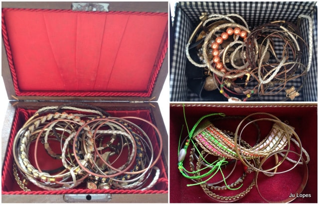 Eis o meu eterno suplício! Eu tenho MUITAS pulseiras e muitos braceletes grandes, o que dificulta super a organização, porque eles simplesmente não cabem em canto nenhum!