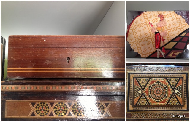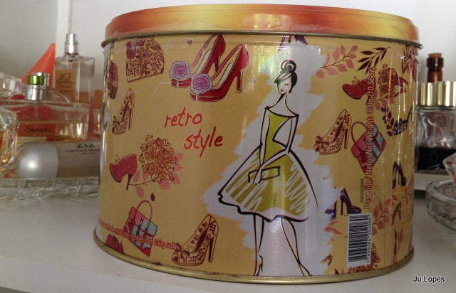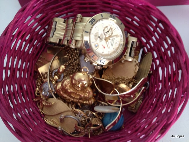 Como tenho várias caixinhas de madeira (amo!), resolvi colocá-las dentro. Peguei três caixinhas e coloquei as pulseiras menores, só que ainda sobrou muita pulseira… Daí, lembrei de uma latinha, daquelas de biscoito, que tinha aqui em casa, e peguei para colocar os braceletes. Mas ainda sobrou pulseira… Aí peguei uma taça, daquelas bem grandes e coloquei tudo dentro!