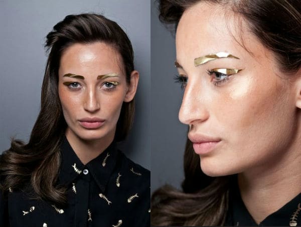 O make foi de Max Weber, com cores opacas e um pó feito de folha de papel dourado. A pele foi hidratada e corrigida.