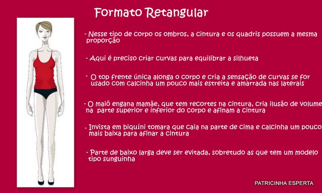 Existem , basicamente, cinco formatos corporais: o formato ampulheta, oval, triangular, retangular e pêra, que é o típico formato de corpo da mulher brasileira.
