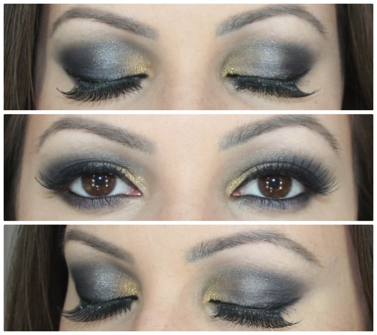 Quando você quiser uma sombra mais luminosa e não tiver exatamente o que você planejou em casa, segue uma dica que eu sempre uso: criar uma base para sombra escura usando dourado e prateado, acaba dando uma luminosidade a mais no esfumado e quebra o gelo dos tons escuros.