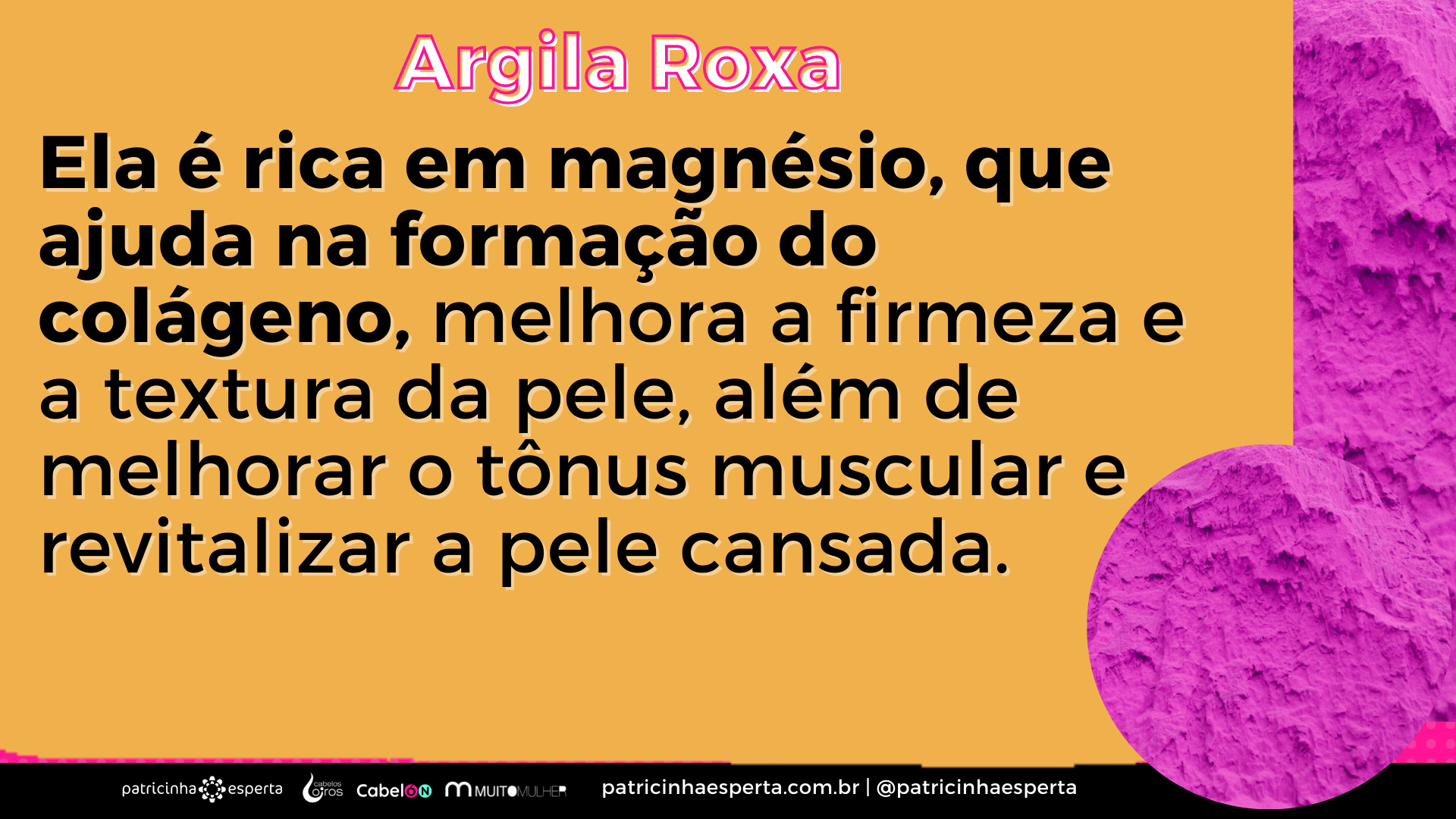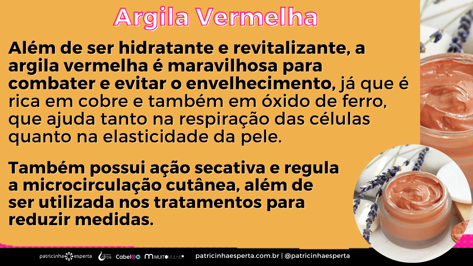 Além de ser hidratante e revitalizante, a argila vermelha é maravilhosa para combater e evitar o envelhecimento, já que é rica em cobre e também em óxido de ferro, que ajuda tanto na respiração das células quanto na elasticidade da pele.