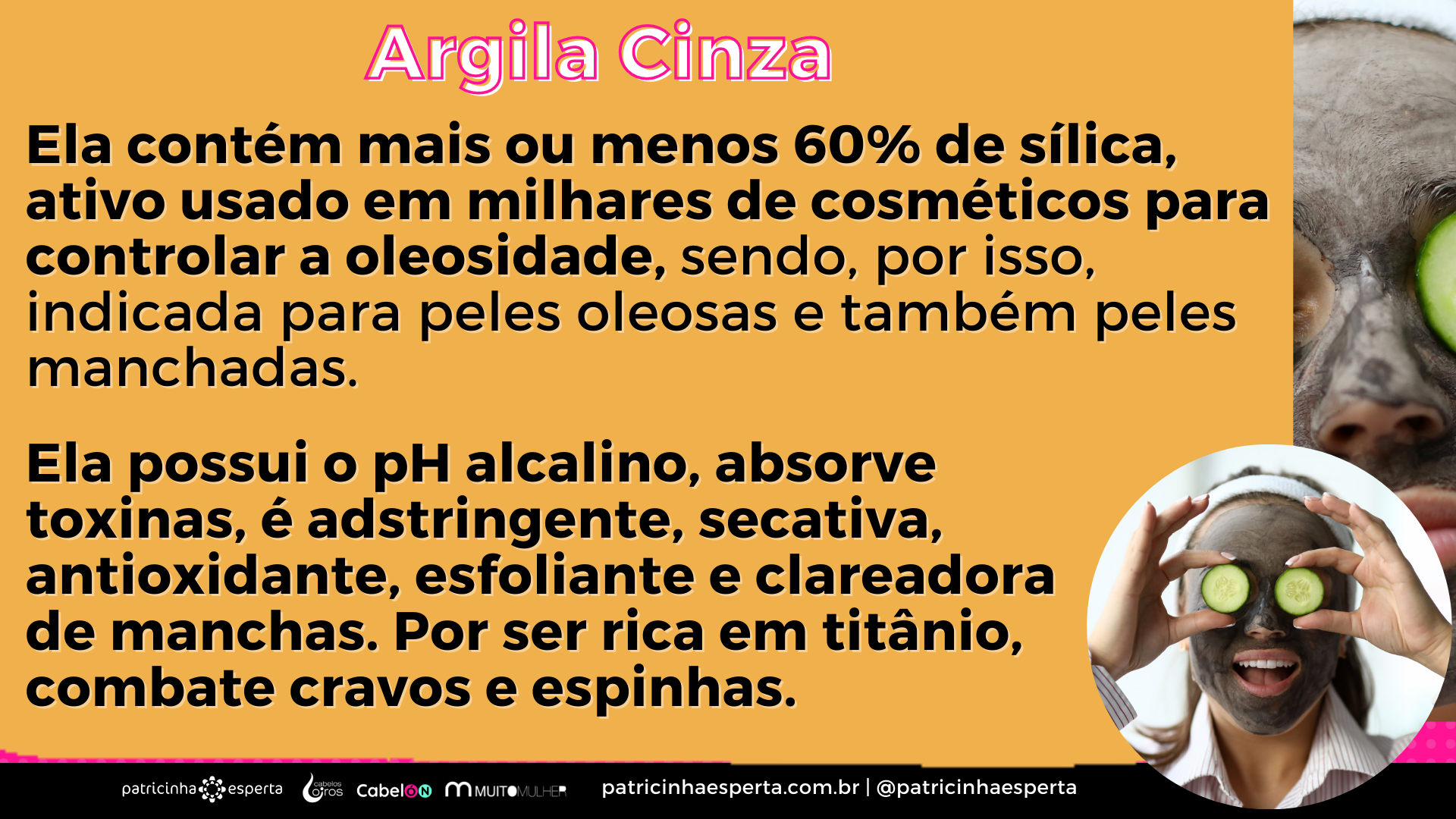 Ela contém mais ou menos 60% de sílica, ativo usado em milhares de cosméticos para controlar a oleosidade, sendo, por isso, indicada para peles oleosas e também peles manchadas.