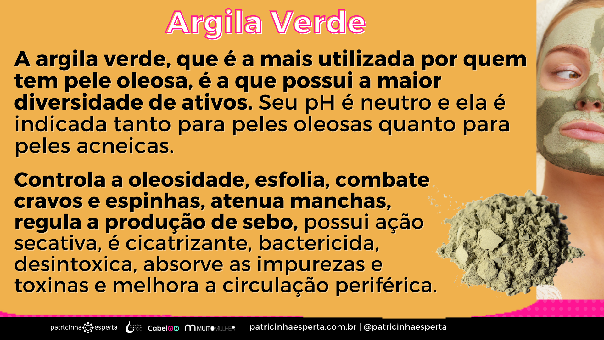A argila verde, que é a mais utilizada por quem tem pele oleosa, é a que possui a maior diversidade de ativos. Seu pH é neutro e ela é indicada tanto para peles oleosas quanto para peles acneicas.