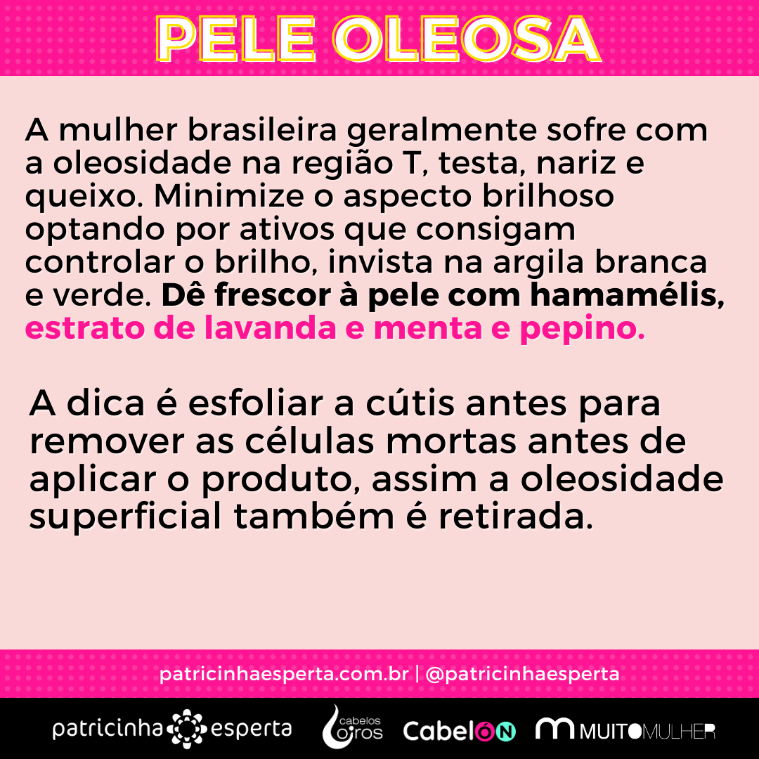 A mulher brasileira geralmente sofre com a oleosidade na região T, testa, nariz e queixo. Minimize o aspecto brilhoso optando por ativos que consigam controlar o brilho, invista na argila branca e verde. Dê frescor à pele com hamamélis, estrato de lavanda e menta e pepino.