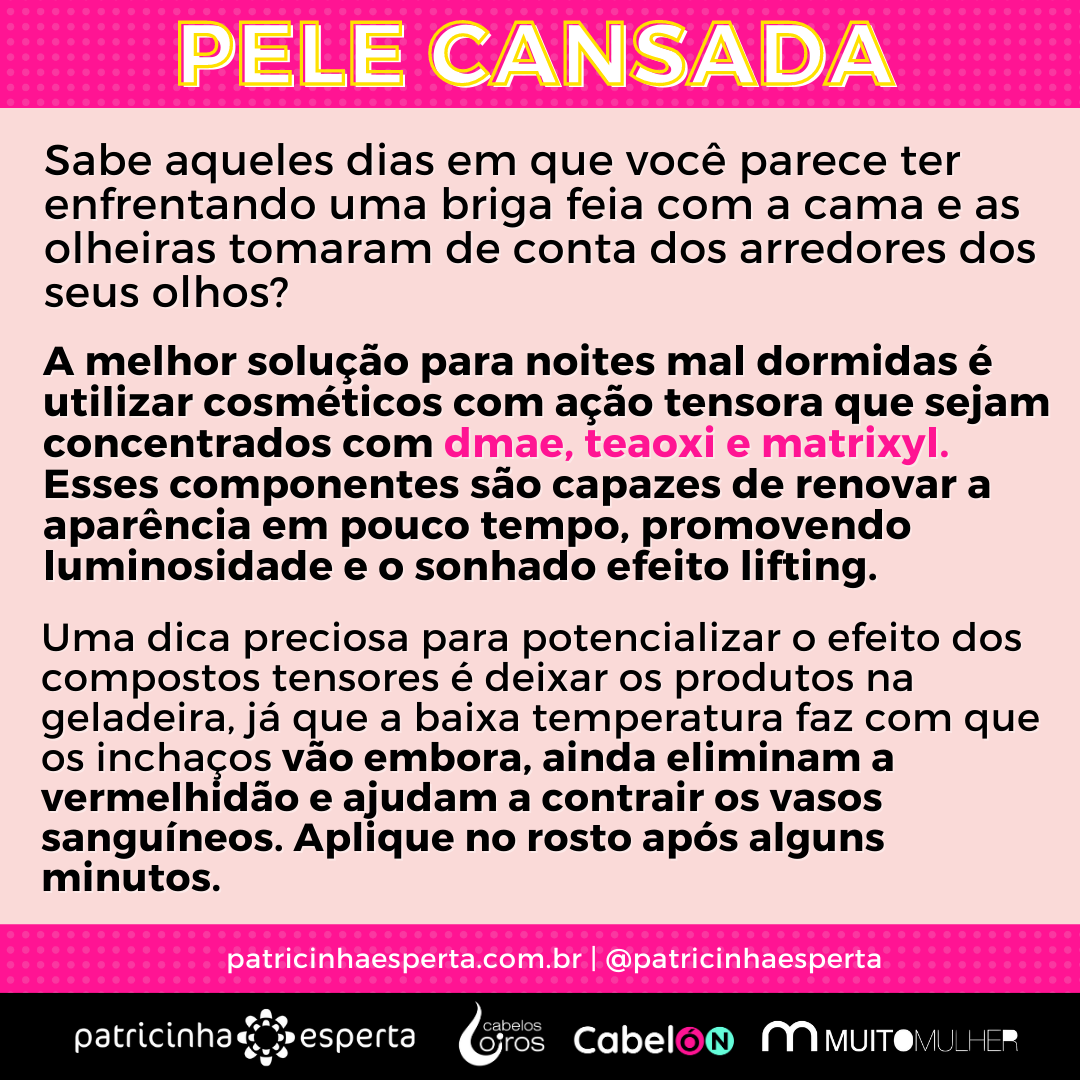 Sabe aqueles dias em que você parece ter enfrentando uma briga feia com a cama e as olheiras tomaram de conta dos arredores dos seus olhos? A melhor solução para noites mal dormidas é utilizar cosméticos com ação tensora que sejam concentrados com dmae, teaoxi e matrixyl. Esses componentes são capazes de renovar a aparência em pouco tempo, promovendo luminosidade e o sonhado efeito lifting.
