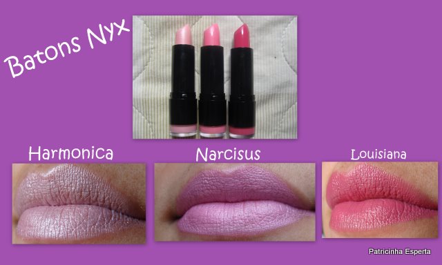 Agora eu sou a feliz proprietária de três batons da Nyx: o Louisiana, o Narcisus e o Harmônica.
