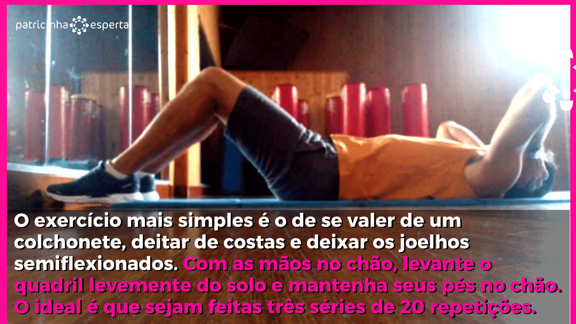 O exercício mais simples é o de se valer de um colchonete, deitar de costas e deixar os joelhos semiflexionados. Com as mãos no chão, levante o quadril levemente do solo e mantenha seus pés no chão. O ideal é que sejam feitas três séries de 20 repetições. Está começando? Então, pegue leve com o seu corpo e faça exercícios pra barriga com três séries de sete repetições e vá aumentando conforme se sentir mais segura.