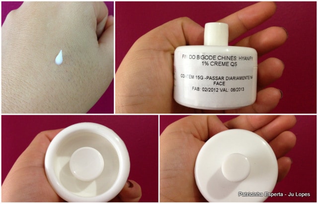 A concentração do meu é a indicada, 1%, e o potinho vem com 20g, o que parece pouco mas rende muito, porque a aplicação é localizada, é só no “bigodinho” mesmo.