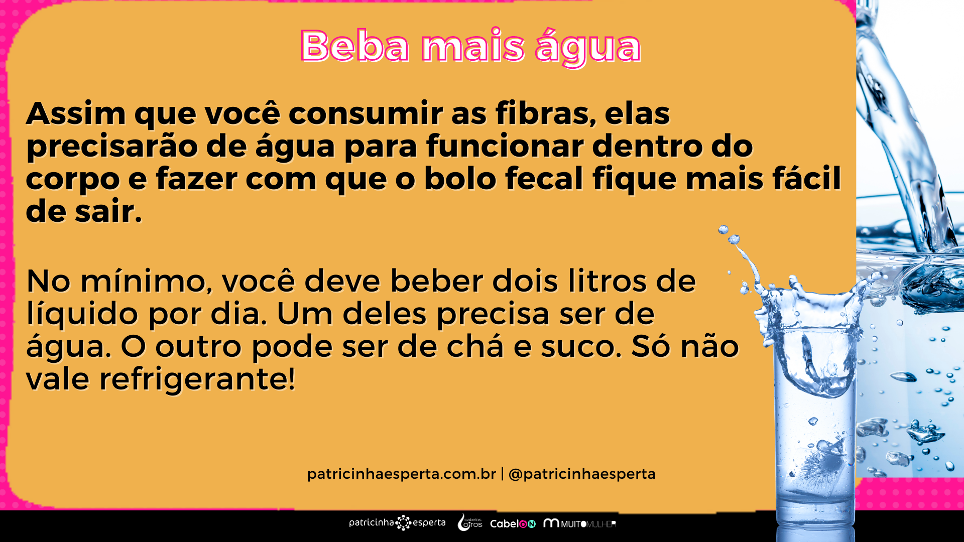 Assim que você consumir as fibras, elas precisarão de água para funcionar dentro do corpo e fazer com que o bolo fecal fique mais fácil de sair.