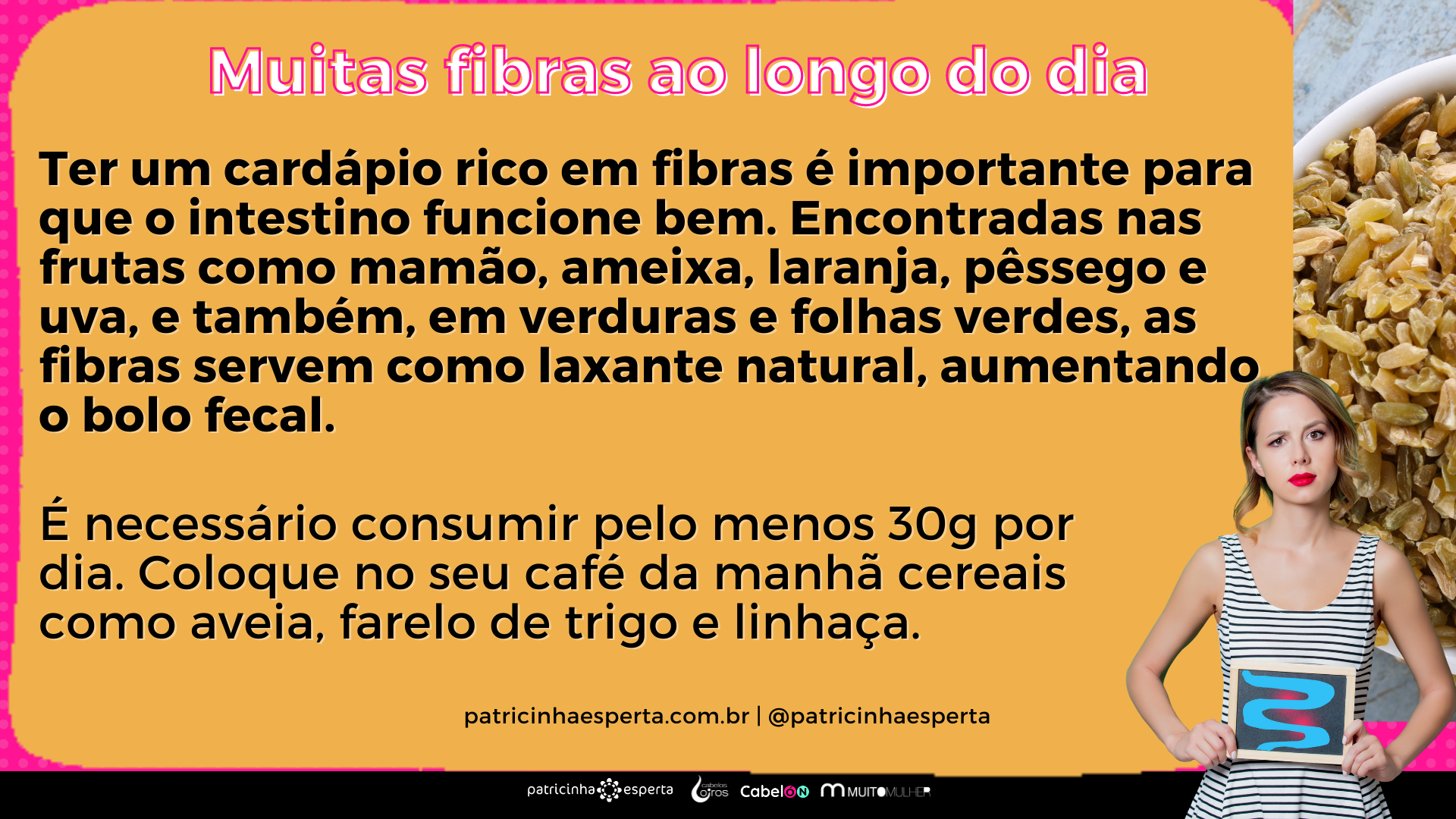 Ter um cardápio rico em fibras é importante para que o intestino funcione bem. Encontradas nas frutas como mamão, ameixa, laranja, pêssego e uva, e também, em verduras e folhas verdes, as fibras servem como laxante natural, aumentando o bolo fecal.
