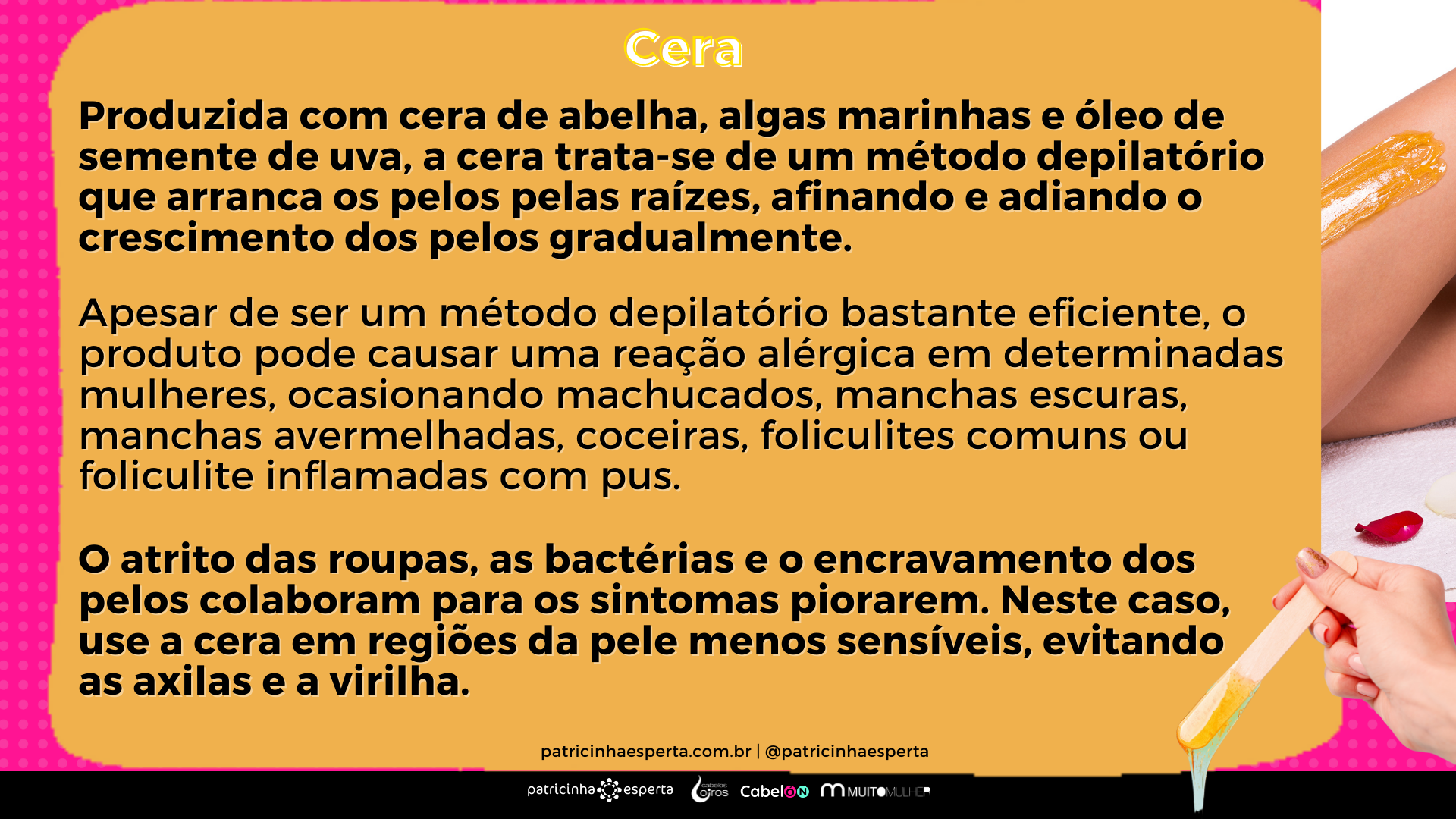 O atrito das roupas, as bactérias e o encravamento dos pelos colaboram para os sintomas piorarem. Neste caso, use a cera em regiões da pele menos sensíveis, evitando as axilas e a virilha.