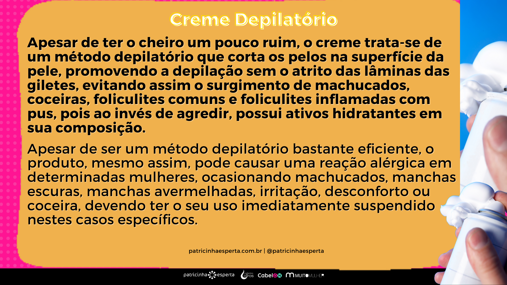Apesar de ter o cheiro um pouco ruim, o creme trata-se de um método depilatório que corta os pelos na superfície da pele, promovendo a depilação sem o atrito das lâminas das giletes, evitando assim o surgimento de machucados, coceiras, foliculites comuns e foliculites inflamadas com pus, pois ao invés de agredir, possui ativos hidratantes em sua composição.