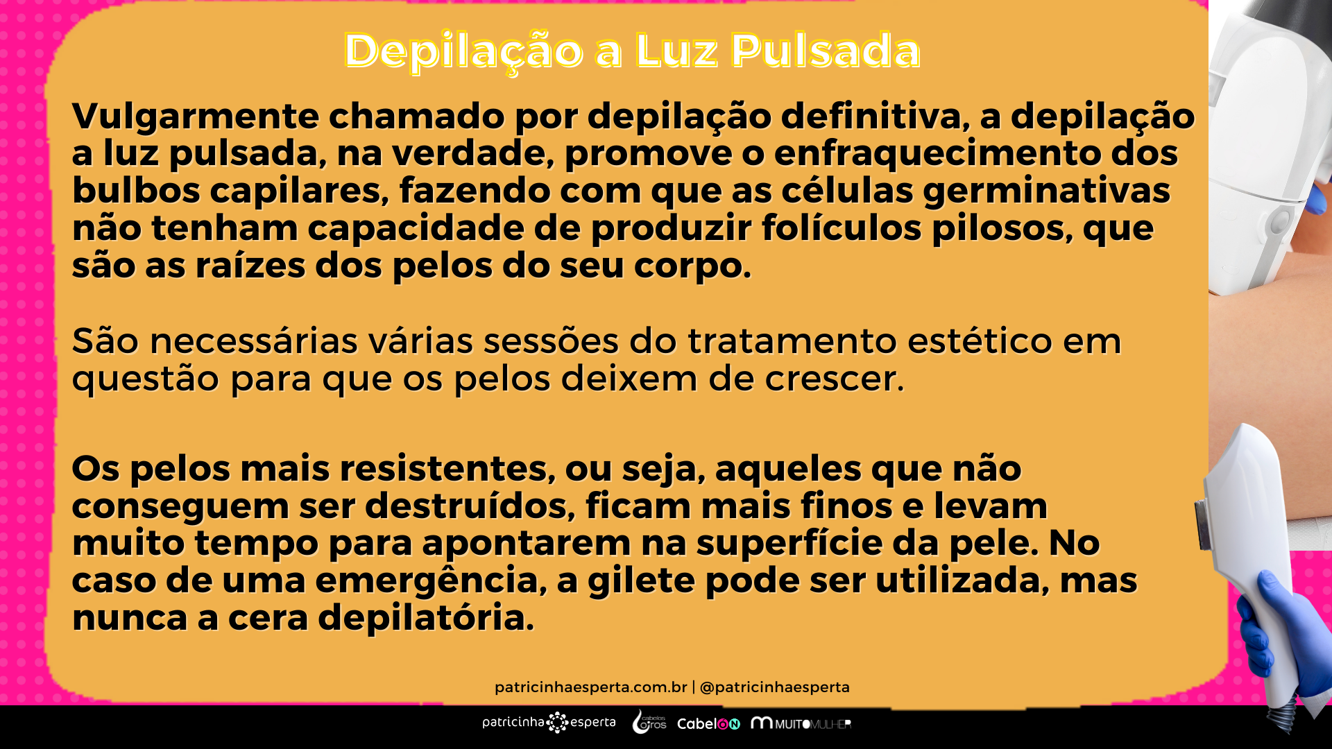 Vulgarmente chamado por depilação definitiva, a depilação a luz pulsada, na verdade, promove o enfraquecimento dos bulbos capilares, fazendo com que as células germinativas não tenham capacidade de produzir folículos pilosos, que são as raízes dos pelos do seu corpo.
