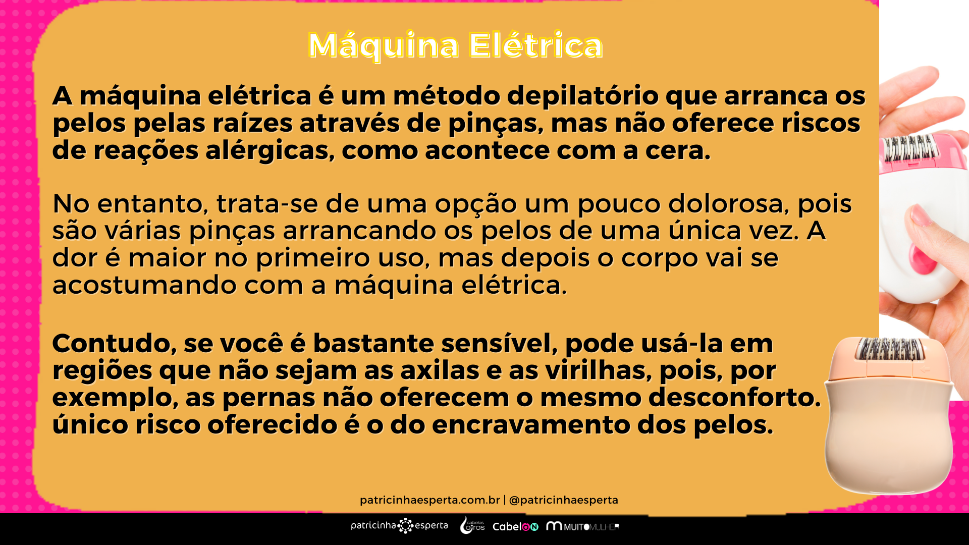 A máquina elétrica é um método depilatório que arranca os pelos pelas raízes através de pinças, mas não oferece riscos de reações alérgicas, como acontece com a cera.