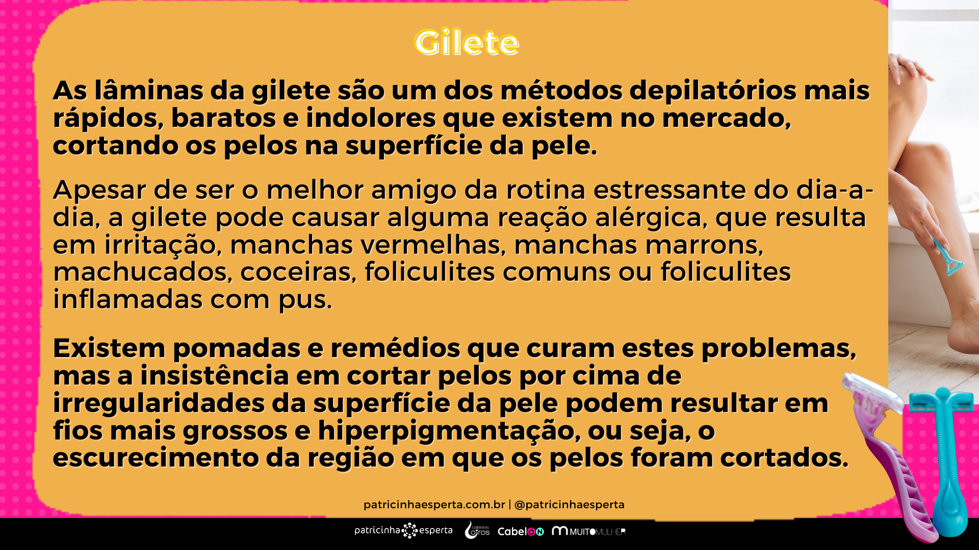 Apesar de ser o melhor amigo da rotina estressante do dia-a-dia, a gilete pode causar alguma reação alérgica, que resulta em irritação, manchas vermelhas, manchas marrons, machucados, coceiras, foliculites comuns ou foliculites inflamadas com pus.