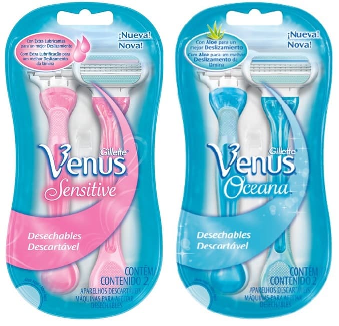 Venus Sensitive e Venus Oceana: este aparelho também possui três lâminas que são individuais e encaixadas em uma cabeça móvel. O diferencial deste produto é que ele tem uma almofadinha com aloe vera e vitamina E. Essa fita quando desbota significa o mesmo que a outra: hora de trocar! Ah, ela tem um cabo ergonômico para grande controle, sendo mais indicada para pernas ou regiões como costas e coxas. Preço sugerido (embalagem com duas unidades): R$ 17,99