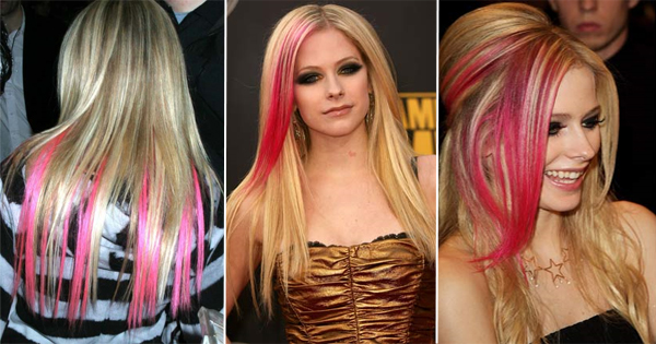 Além dos tons loiros, Avril teve seus cabelos castanhos e mechados com preto.
