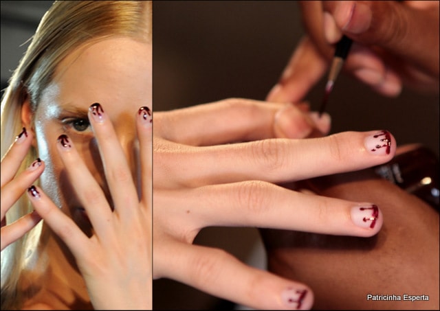 As unhas das modelos davam a impressão de que haviam sido mergulhadas em um pote de esmalte e escorreram, o que deu um efeito bem legal.