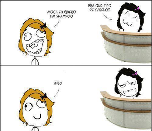 Hoje estava no face e vi um”meme” que me fez rir muito. A mocinha entra na perfumaria e pede um shampoo, a atendente pergunta “para qual tipo de cabelo?” e a mocinha responde: “sujo”, confiram: