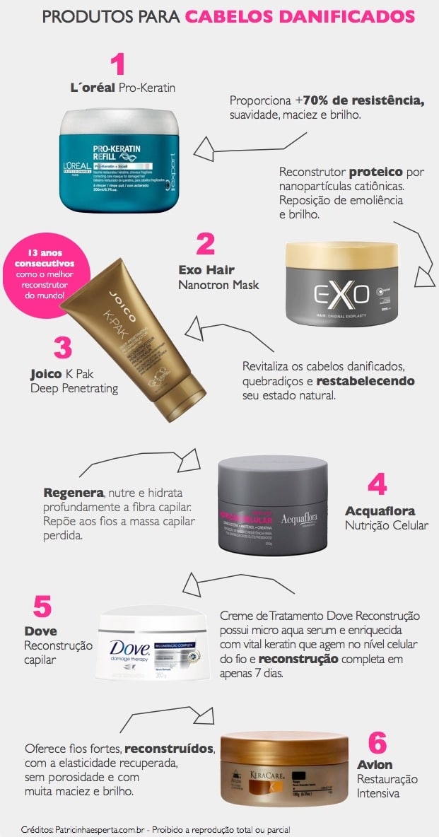 - Aqui a opção por Máscaras Hidratantes Reconstrutoras também é uma boa opção, pois como no caso do Cabelo Quebradiço, a Hidratação precisa reconstruir o fio por causa dos danos causados pelos procedimentos químicos na extensão dos fios e, inclusive, no interior deles.