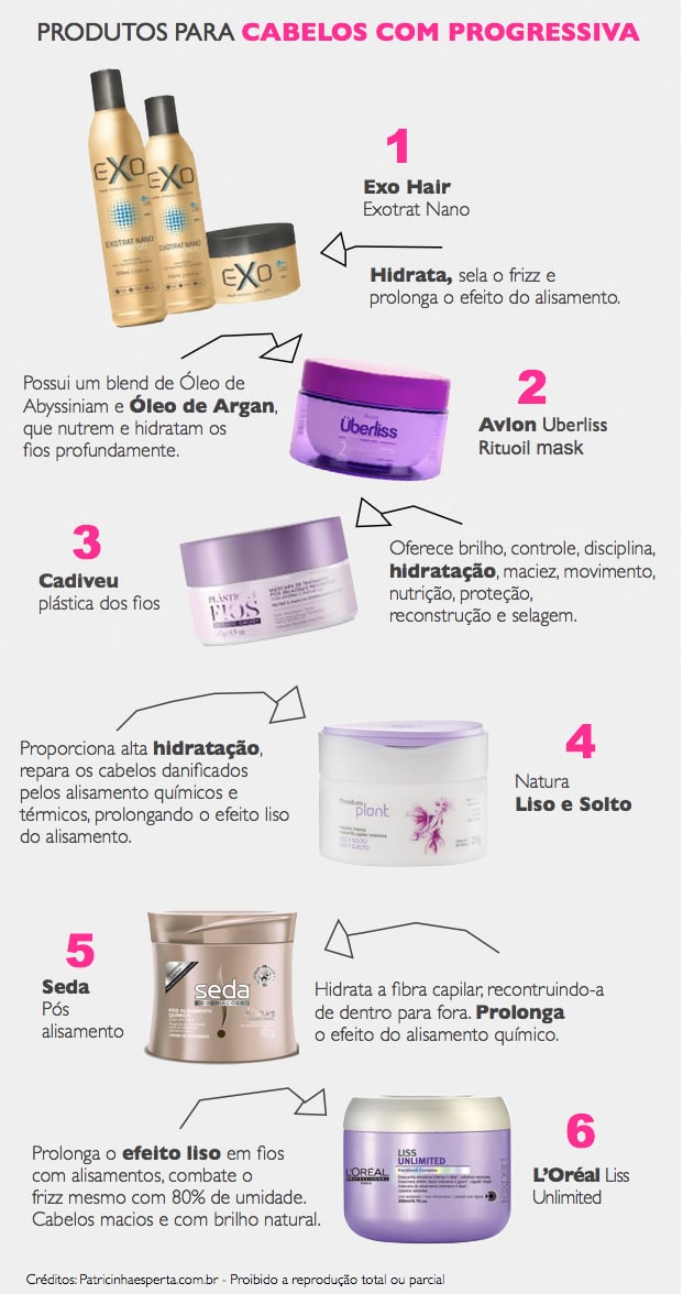 - Dentre as máscaras hidratantes reconstrutoras, opte por aquelas com Queratina na composição, pois essa substância tem papel vital na manutenção da hidratação dos cabelos com progressiva.