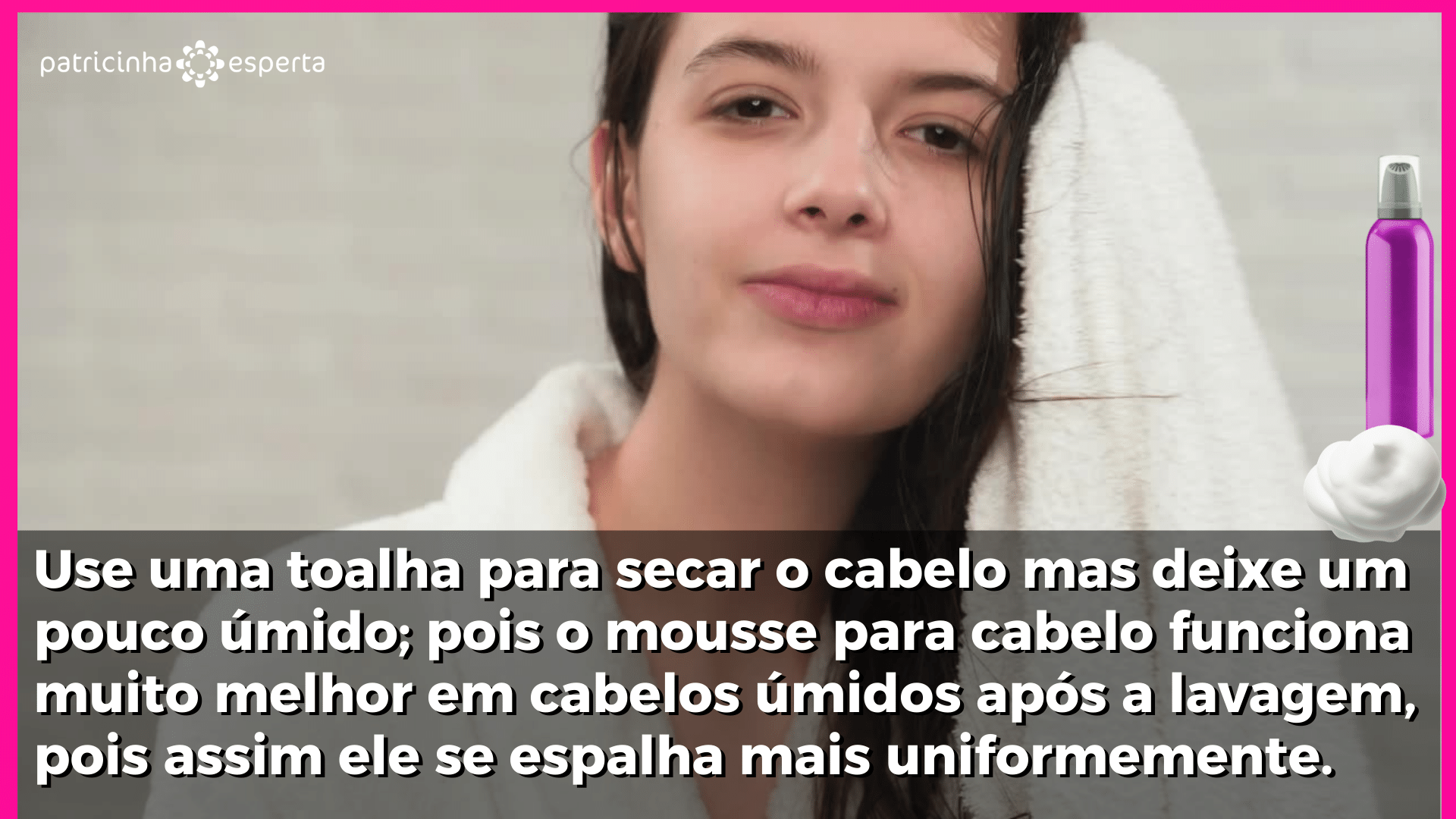 Passo 2 Use uma toalha para secar o cabelo mas deixe um pouco úmido; pois o mousse para cabelo funciona muito melhor em cabelos úmidos após a lavagem, pois assim ele se espalha mais uniformemente.
