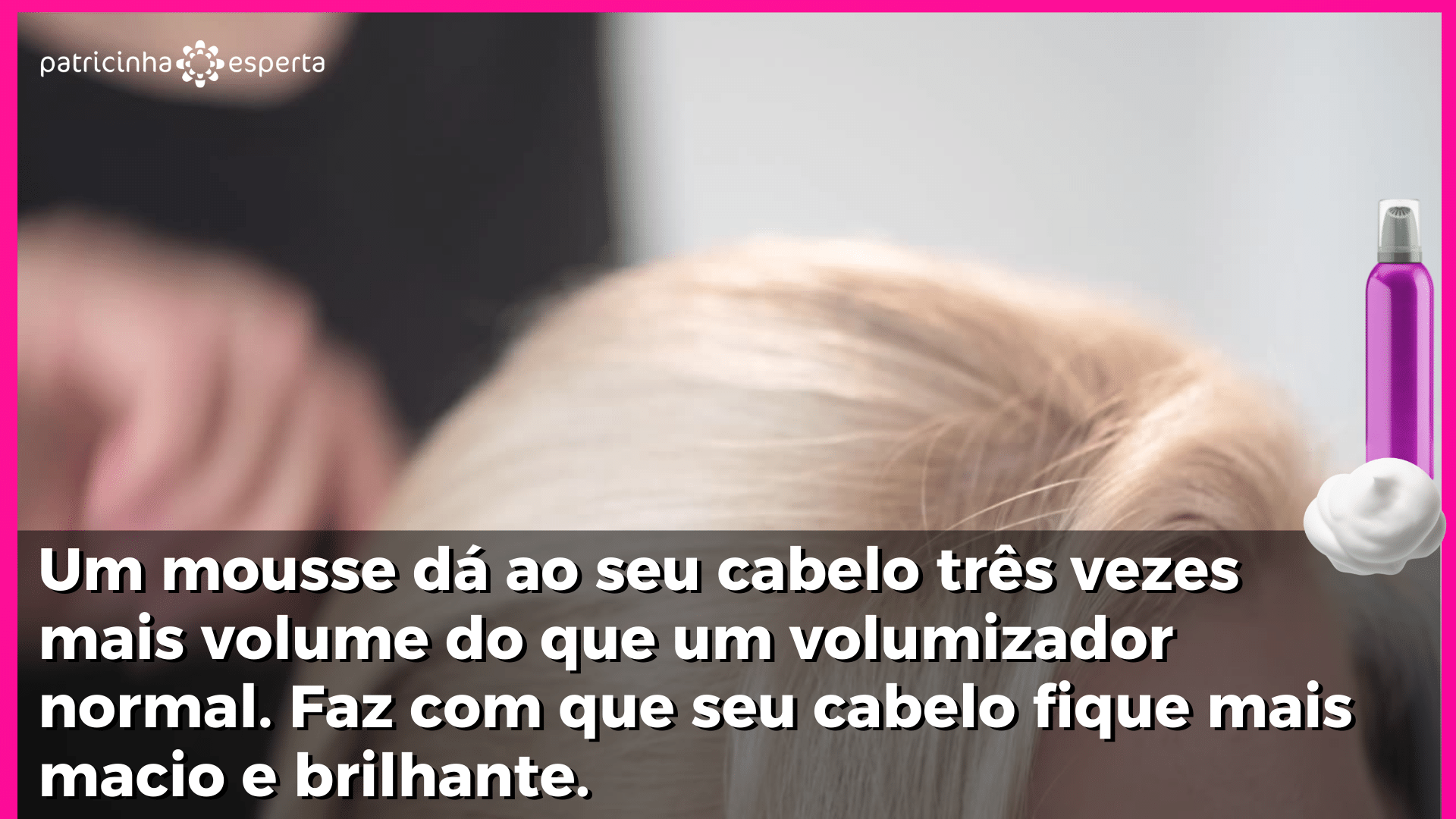 Um mousse dá ao seu cabelo três vezes mais volume do que um volumizador normal. Faz com que seu cabelo fique mais macio e brilhante. A melhor parte de usar um mousse de cabelo é que ele não deixa seu cabelo “pegajoso”. Se você tem cabelo fininho como o meu, ele é seu melhor amigo pois fornece um aumento de volume e textura sem pesar o fio fino. A grande maioria dos produtos contém a classificação de leve ou suave, médio, forte e extra fixação. Pro dia a dia, o ideal é o leve, no máximo médio, porque os produtos de fixação forte e extra forte “armam” muito os cabelos.