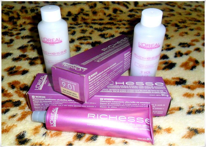 Este é o tonalizante que utilizo para matizar as mechas após a descoloração. Richesse L’Oreal 9.01 (Milk Shake Gelo):