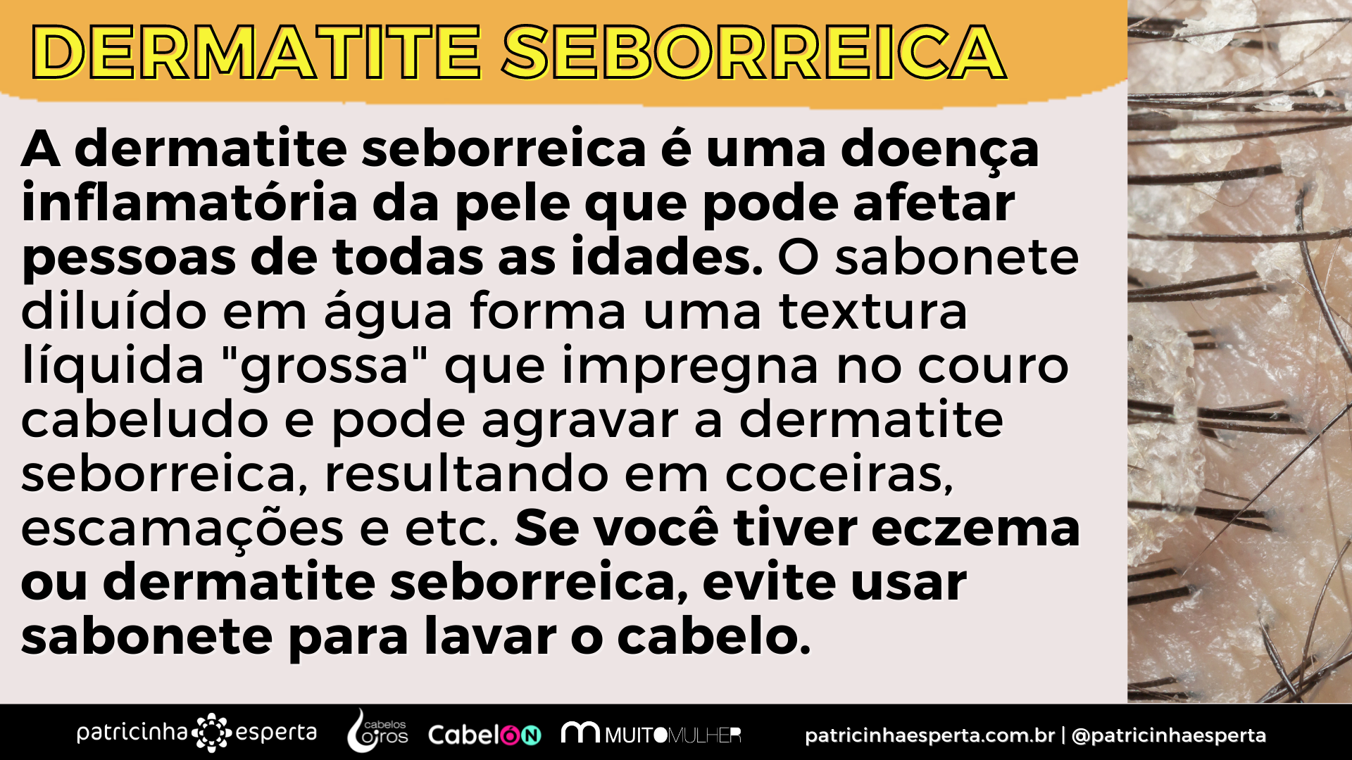 A dermatite seborreica é uma doença inflamatória da pele que pode afetar pessoas de todas as idades. O sabonete diluído em água forma uma textura líquida “grossa” que impregna no couro cabeludo e pode agravar a dermatite seborreica, resultando em coceiras, escamações e etc. Se você tiver eczema ou dermatite seborreica, evite usar sabonete para lavar o cabelo.