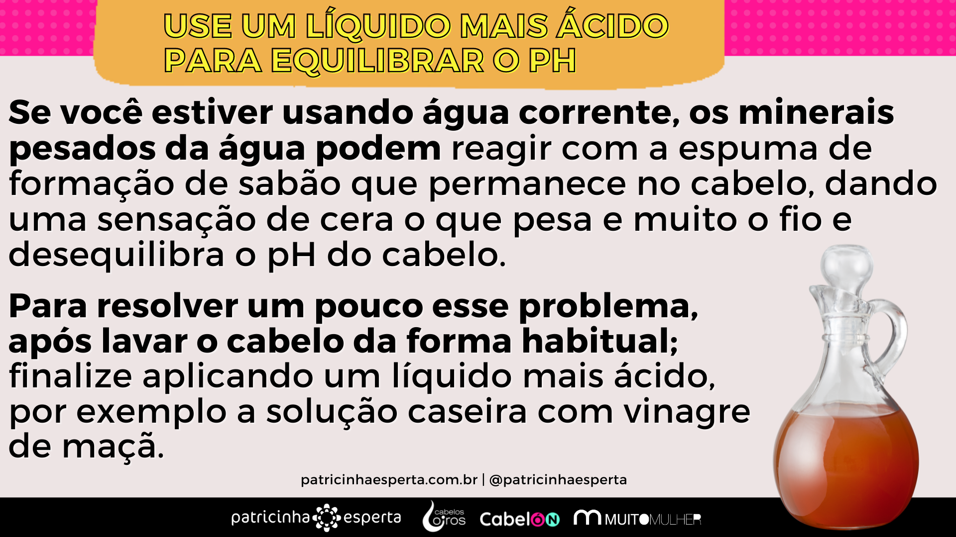 Para resolver um pouco esse problema, após lavar o cabelo da forma habitual; finalize aplicando um líquido mais ácido, por exemplo a solução caseira com vinagre de maçã que já ensinamos aqui.