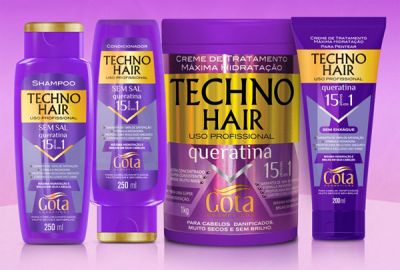 O Shampoo e condicionador Techno Hair Queratina Gota Dourada traz a mais alta tecnologia em hidratação profunda para recuperação dos cabelos muito secos e danificados, através da ação conjunta de 15 ativos que compõe sua exclusiva formulação. Proporcione máxima hidratação e brilho nos cabelos, com ação imediata e resultado prolongados.