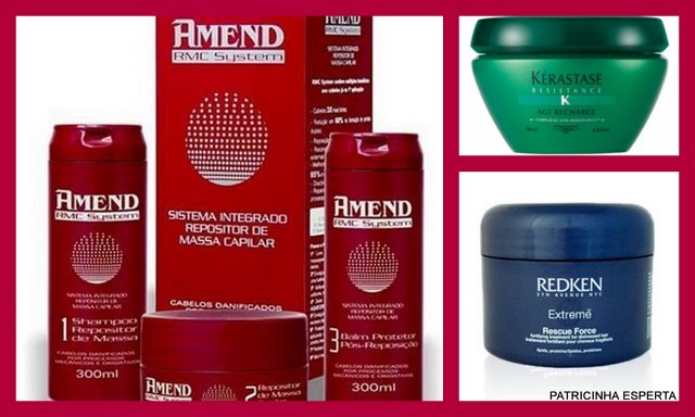 Uma linha que sempre indico para reparação é a RMC, da Amend. Além disso são boas opções o Super Reconstrutor , da Avlon, a Redken Extreme Rescue Force, a Age Recharge, da Kerástase e a Máscara Absolut Repair, da L`Oréal.