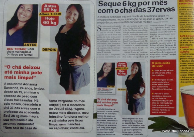 Na revista Viva da semana passada saiu uma reportagem com a Adrianna Santanna, leitora aqui do Patricinha Esperta e minha amiga, que emagreceu 28 kilos usando o chá das 37 ervas.
