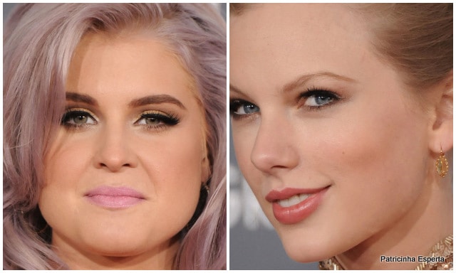 A Taylor Swift usou a mesma make de sempre, mudando só o batom… Gosto desse douradinho com marrom esfumado porque não tem erro. A gente sempre fica bonita e ponto. O batom rosa meio queimado, que eu amei ao cubo, ficou bem mais suave que os vermelhões que a moça costuma usar.