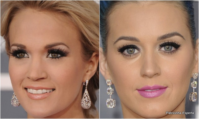 A Katy Perry investiu no delineado grosso, cílios postiços e sombra brilhante. Até aí ok, mas o batom eu não gostei nem um pouco…