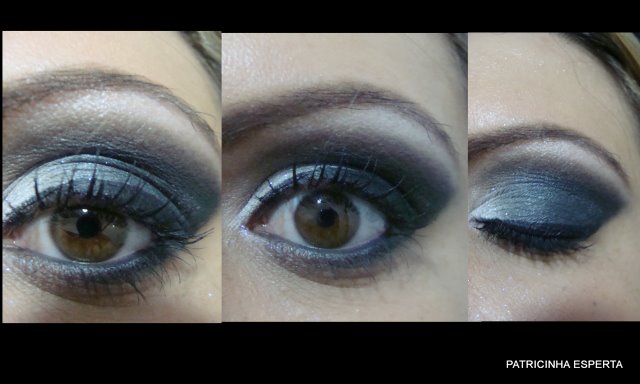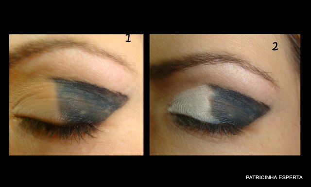 Começo o make aplicando o lápis preto do meio até o canto externo do olho ( foto 1) e em seguida aplico o lápis branco do meio até o canto interno ( foto 2).