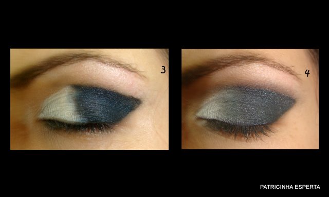 Pego a sombra black do quarteto, que é um preto ( na verdade chumbo) opaco, e espalho em cima do local que está com o lápis preto ( foto 3) e a sombra branco perolado e espalho em cima do local que está com o lápis branco ( foto 4) e vou esfumando em direção ao canto externo do olho.