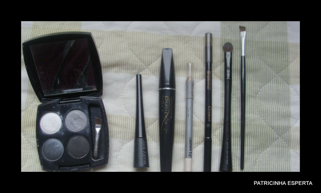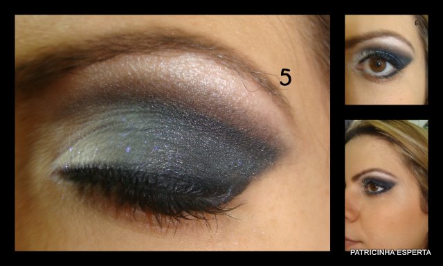 Delineio a linha dos cílios superiores com um delineador preto usando um traço médio que começa do início do canto interno e ultrapassa um pouco e para cima o canto externo dos olhos. Uso lápis branco na linha d`água da raíz dos cílios inferiores e com um pincel chanfrado aplico levemente um pouco da sombra preta embaixo da linhad`água dos cílios inferiores ( foto 6).