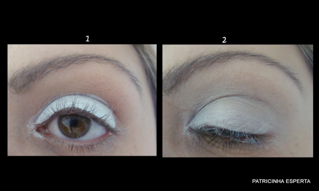 Comecei aplicando o jumbo branco da Nyx, que pode ser substituído por qualquer lábis branco macio, em toda a pálpebra móvel ( foto 1) e espalhei bastante com os dedos, puxando até rente à sobrancelha (foto 2).