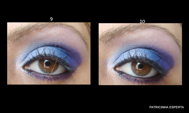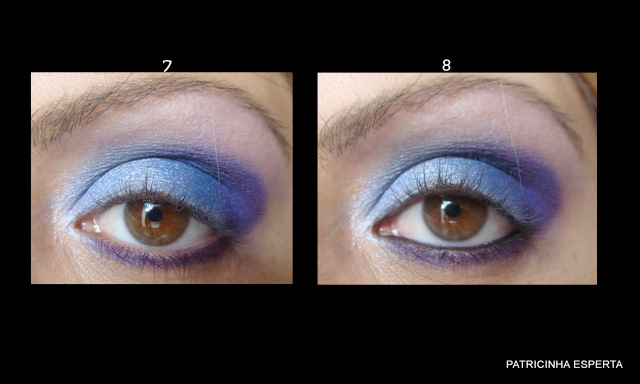 Apliquei, com um pincel chanfrado, sombra roxa rente a raiz dos cílios inferiores ( foto 7), sombra lilás rente à sobrancelha e lápis preto rente a raiz dos cílios inferiores ( foto 8).