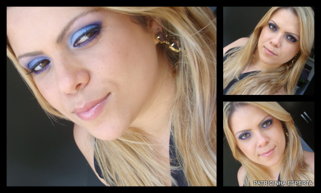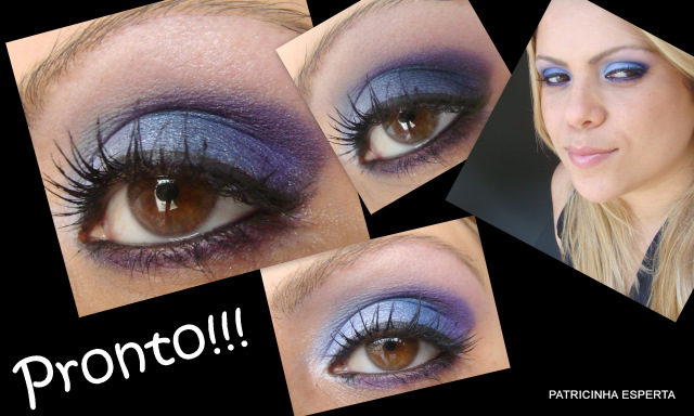 Feito isso, apliquei a sombra roxa no canto externo e no côncavo, por cima da sombra preta ( foto 5) e apliquei a sombra azul no centro da pálpebra móvel, esfumando em direção ao canto externo (foto 6).