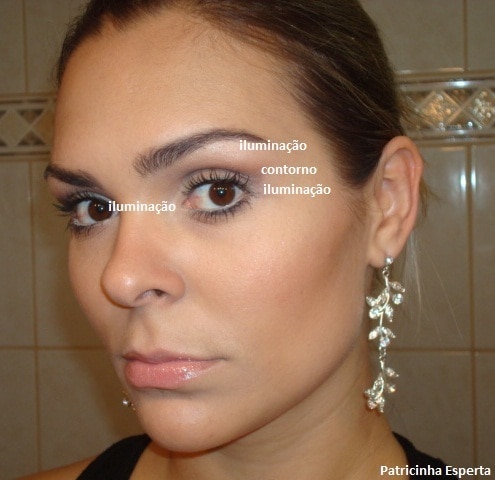 A iluminação basicamente é feita no canto interno dos olhos e abaixo das sobrancelhas, podendo também ser feita no canto externo dos olhos, dando mais acabamento à maquiagem (adoro esse efeito – confiram no vídeo).