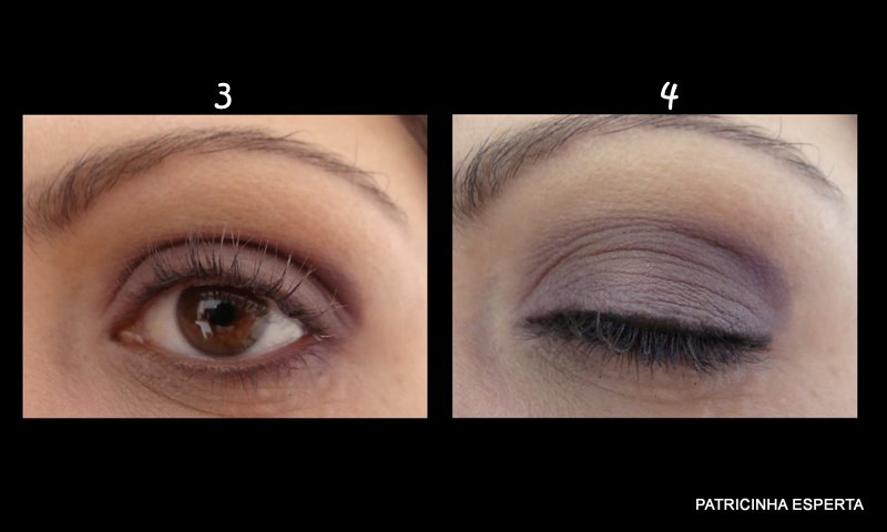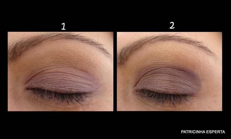 Começo aplicando uma sombra lilás opaca bem clara em toda a pálpebra móvel ( foto 1) e em seguida marco o côncavo e o canto externo com uma sombra lilás um pouco mais escura ( foto 2).